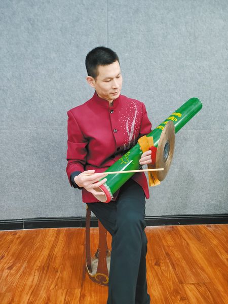 陈佩正在演奏镇安渔鼓,鼓点铿锵,韵味悠长。