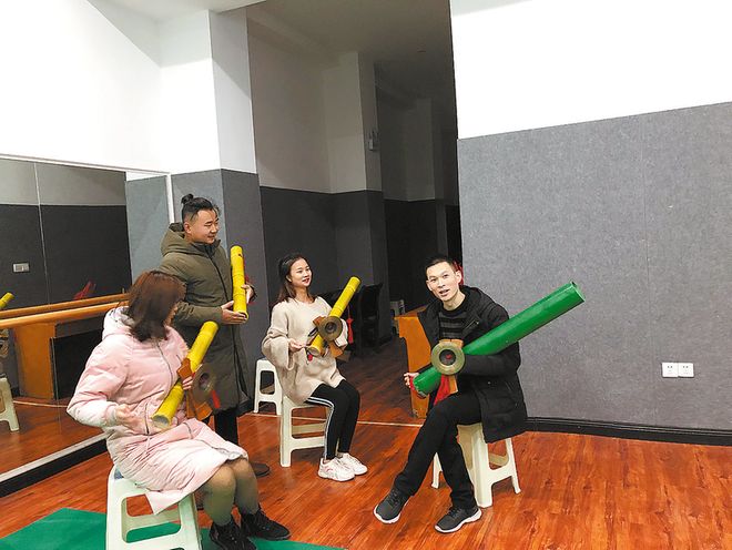 1月6日,陈佩(右一)在镇安县剧团排练厅里手把手指导青年学员。