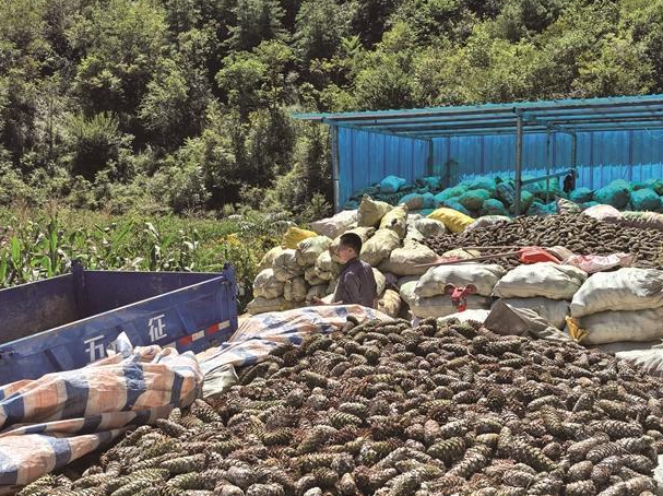 2025年10月,在镇安县青铜关镇阳山村,收购点堆满华山松松塔(资料照片)。 受访者供图